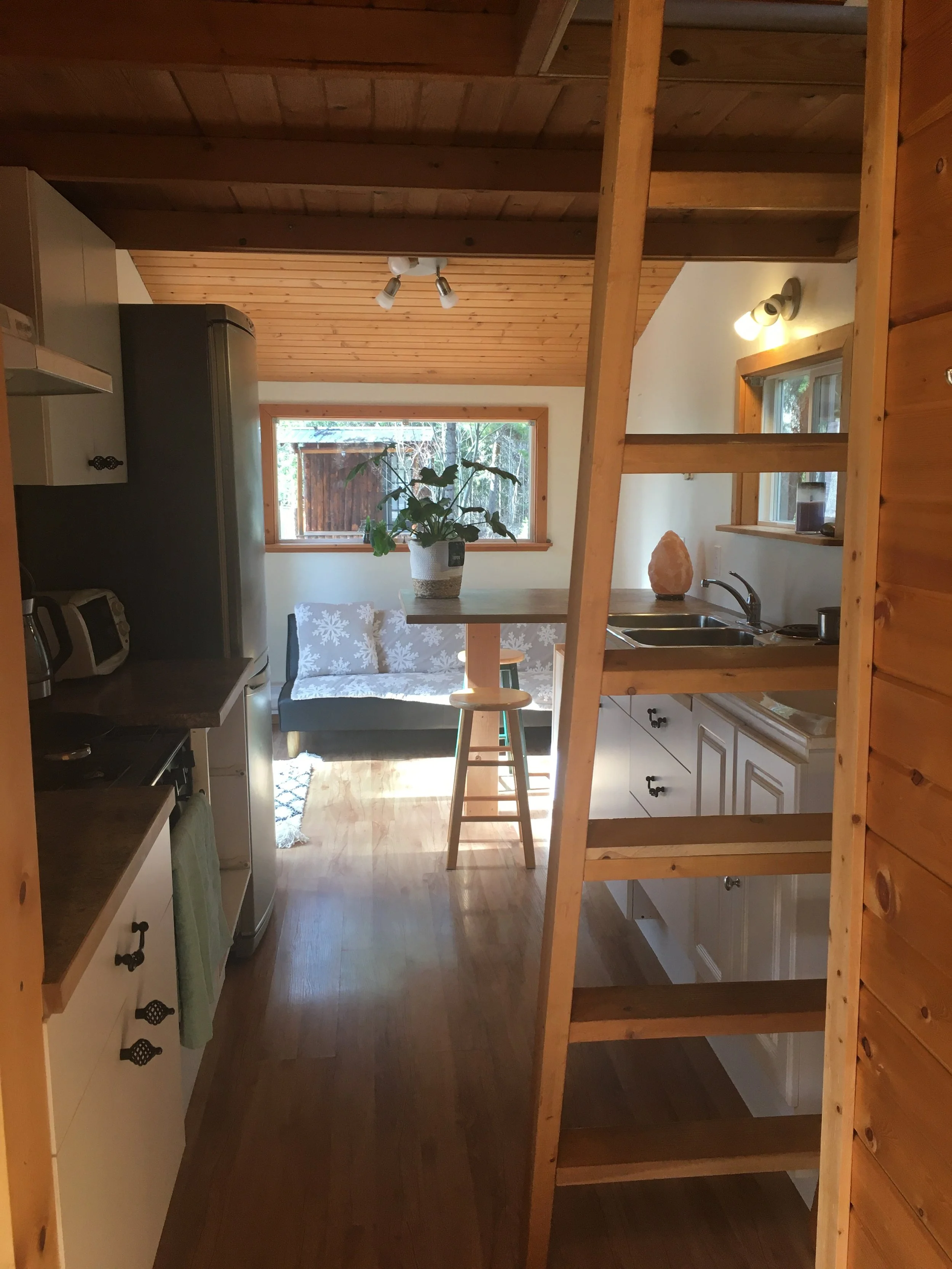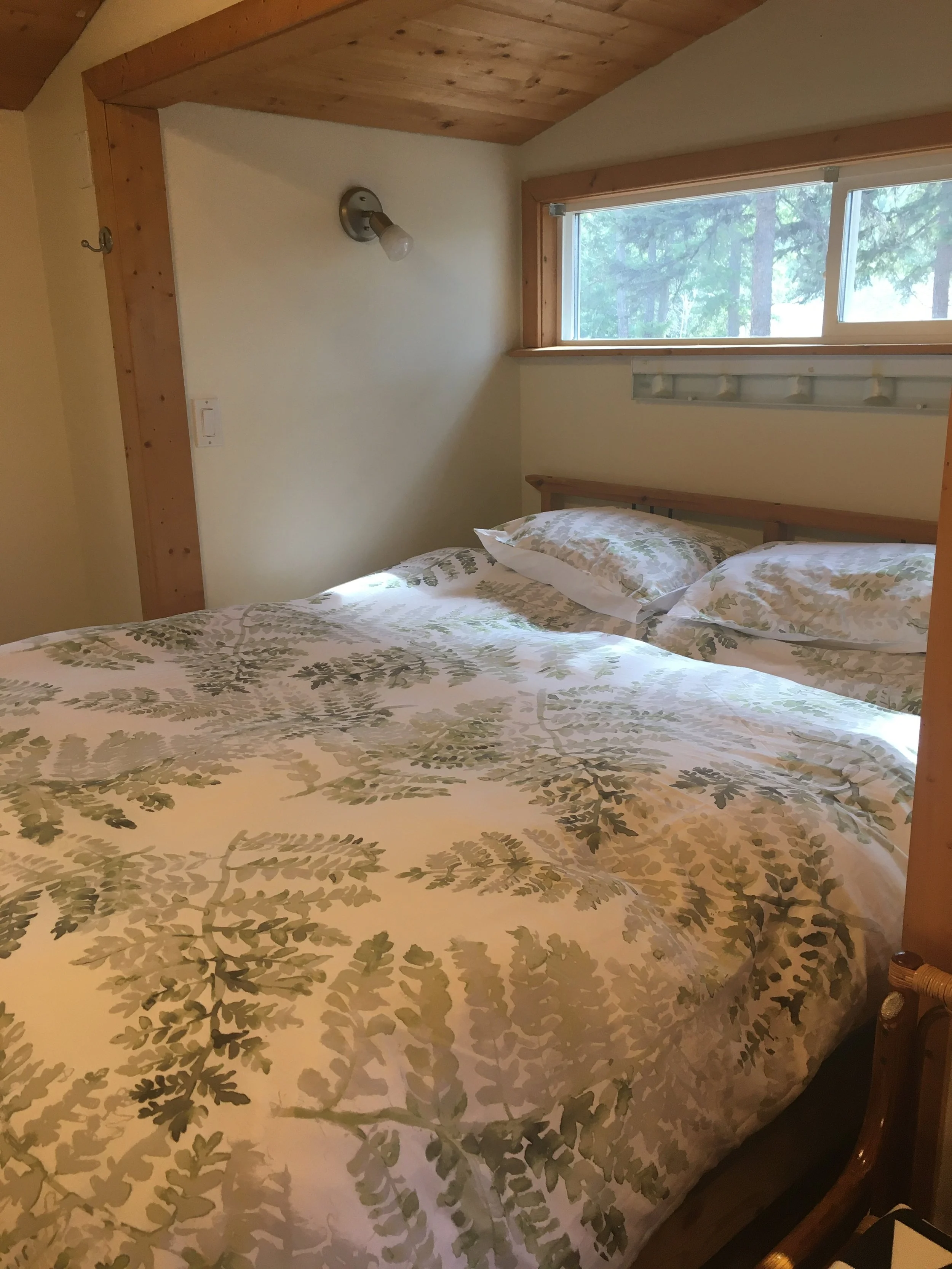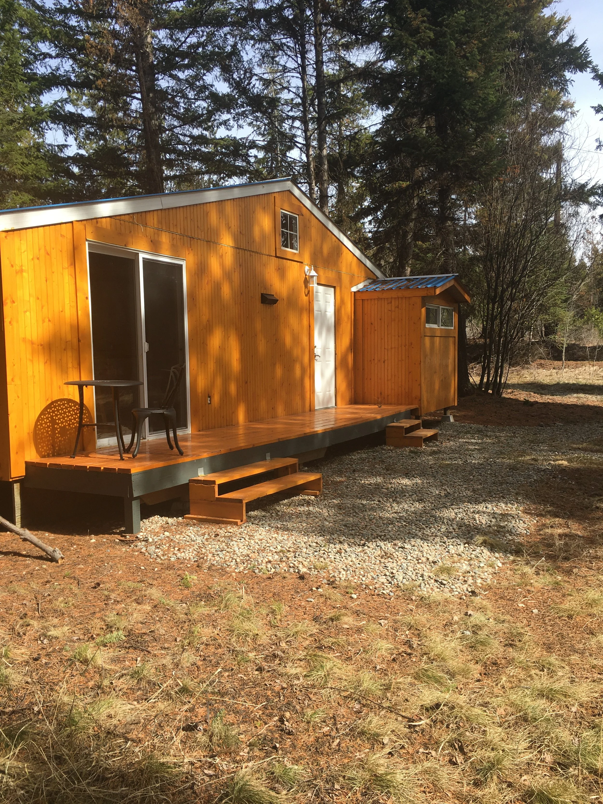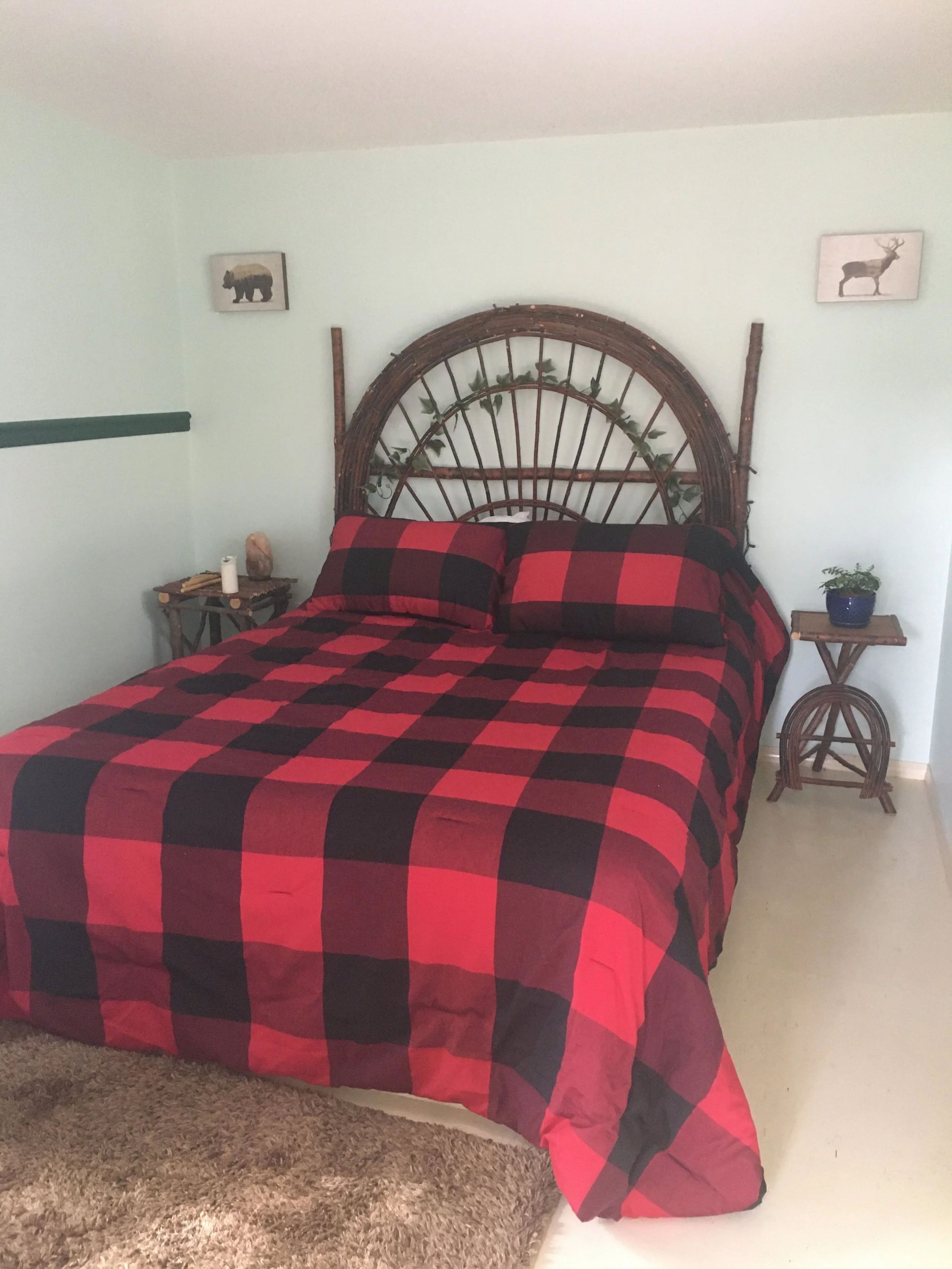 The Condo: Featuring a small kitchen with fridge/freezer, stove top, toaster oven, kitchen sink, and bathroom (Plumbing to this cabin is seasonal: water shuts off when temperature falls below freezing). Also has a queen size bed downstairs and two twin mattresses in the loft upstairs (perfect for older kids!)
