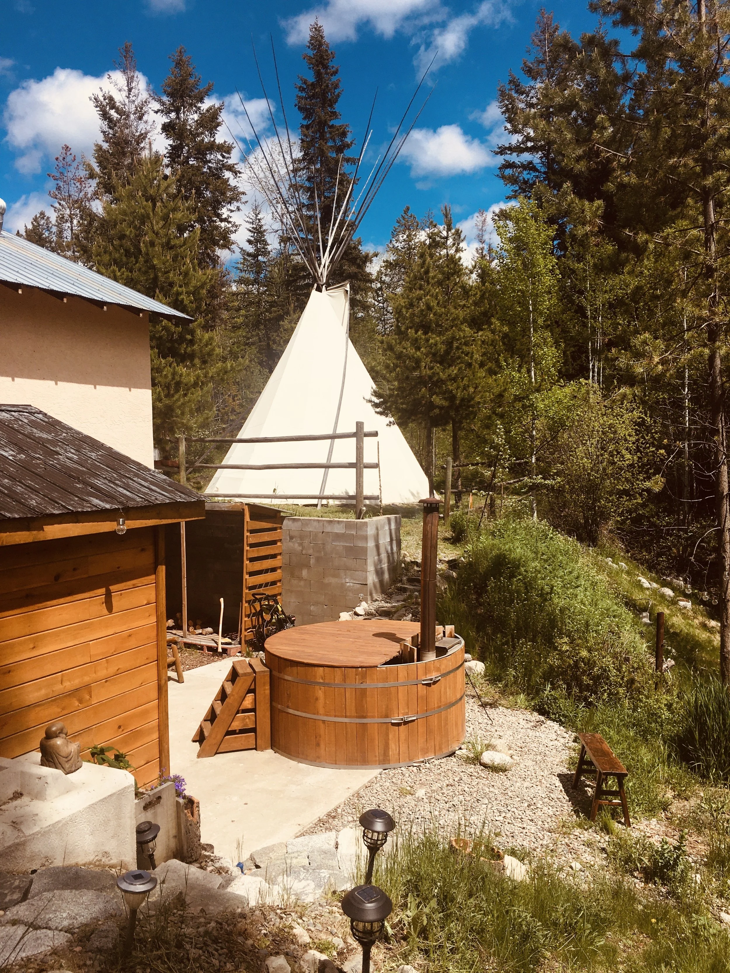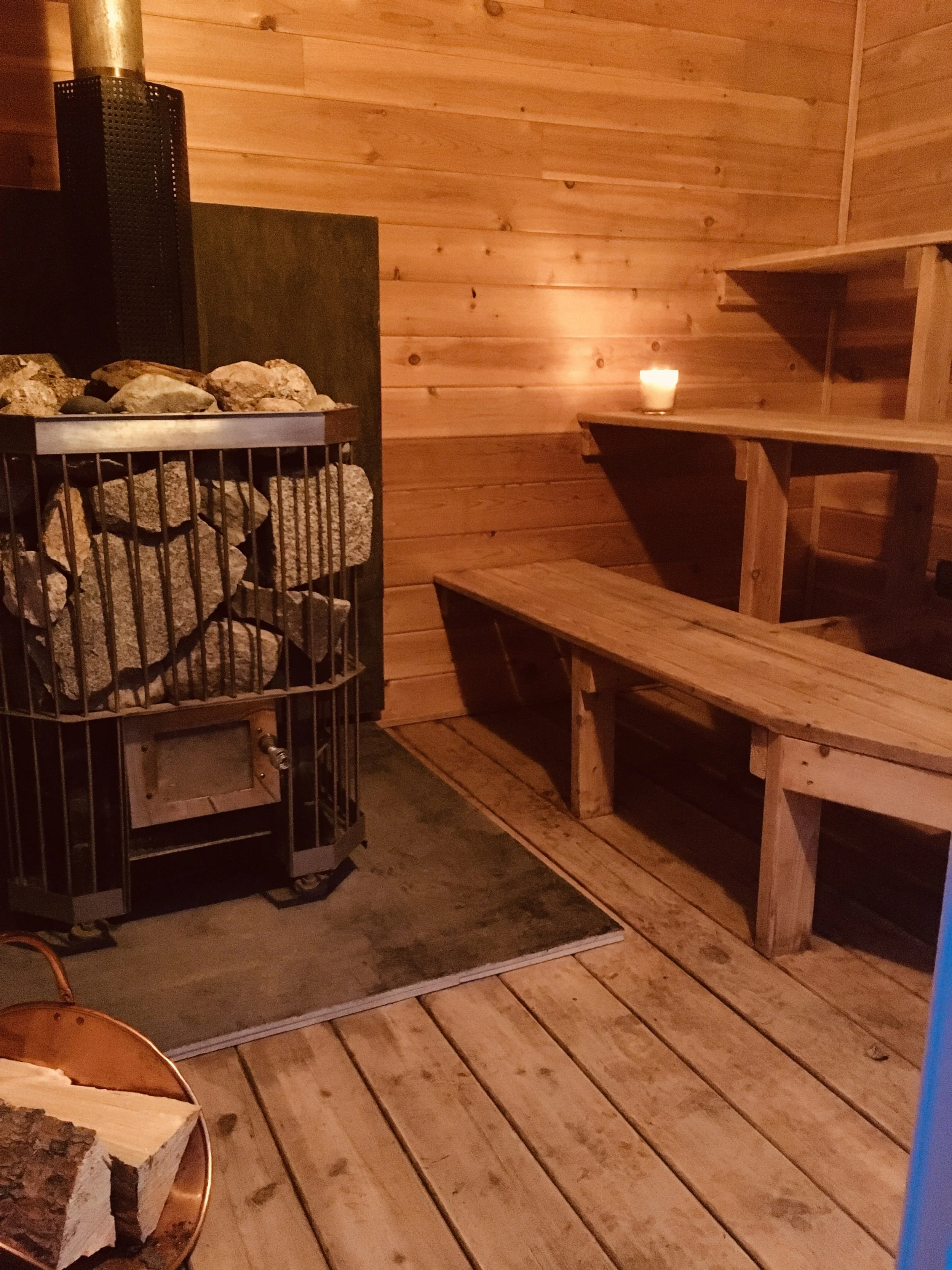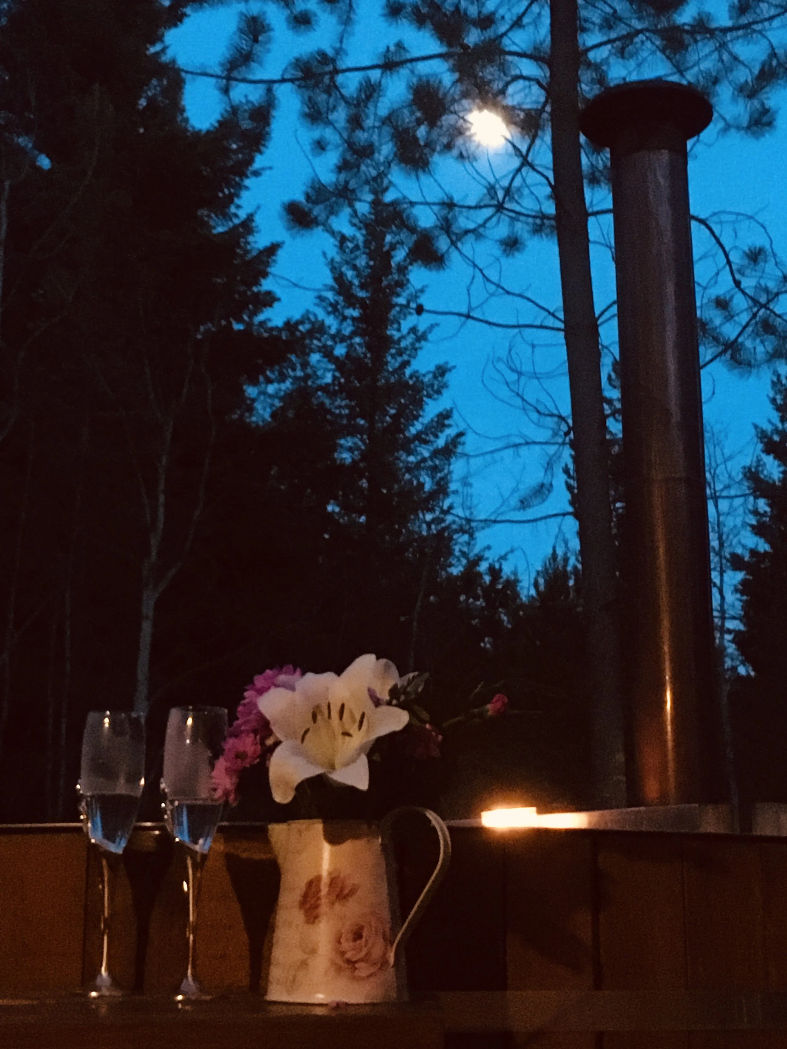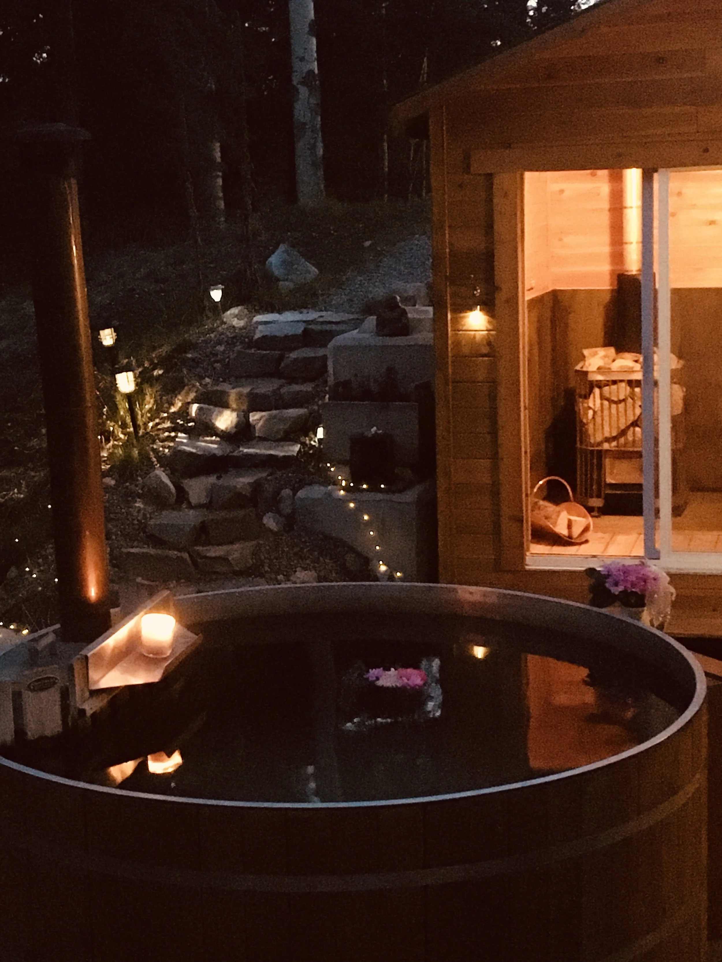 • A wood burning hot tub and sauna in a private setting overlooking the forest